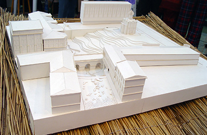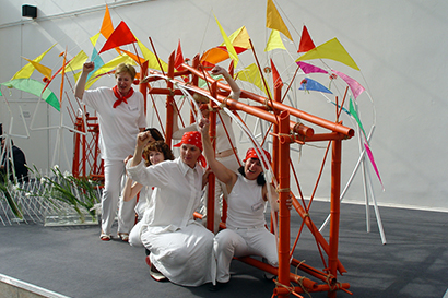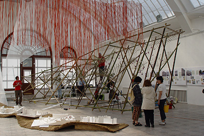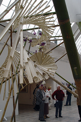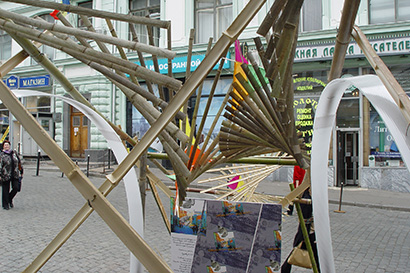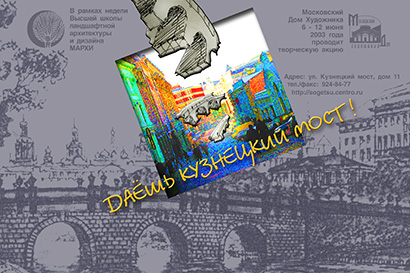 И вот, пятьсот лет спустя, в МДХ на Кузнецком мосту волею и талантом преподавателей и студентов Высшей школы ландшафтной архитектуры и дизайна МАРХИ под музыку Георгия Свиридова на глазах москвичей пророс из асфальта СИМВОЛ – МОСТ. Этот масштабный символ – мост из бамбука «прорвал» окна зала и заполнил выставочное пространство. В выставочном зале «текла» река Неглинка, по которой «плыли» архитектурные студенческие проекты 2003 года на тему «Топонимика Москвы».